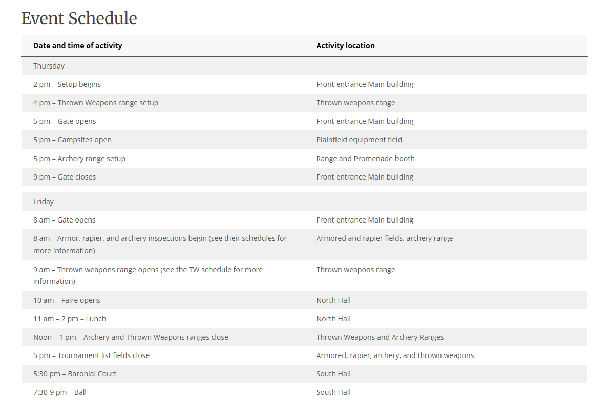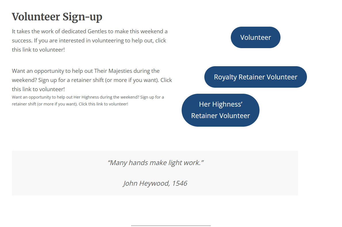 The SCA is a nonprofit group and, thus, relies on volunteers to make the magic happen. I set up links for general volunteers as well as for Their Majesties and Her Highness (for more information regarding how the SCA works, visit their website). I also included the quote to help break up text and provide more flow to the page.