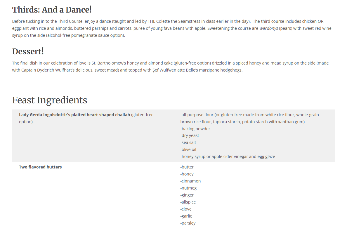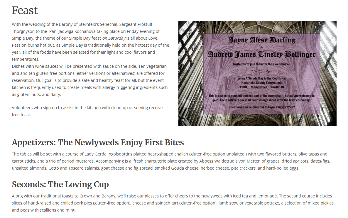 Our local group’s Seneschal (similar to group President) got married at Simple Days, so our Feast steward designed a feast around the theme of love (and marriage). This is an image describing the feast’s theme and the first couple of courses for the meal.