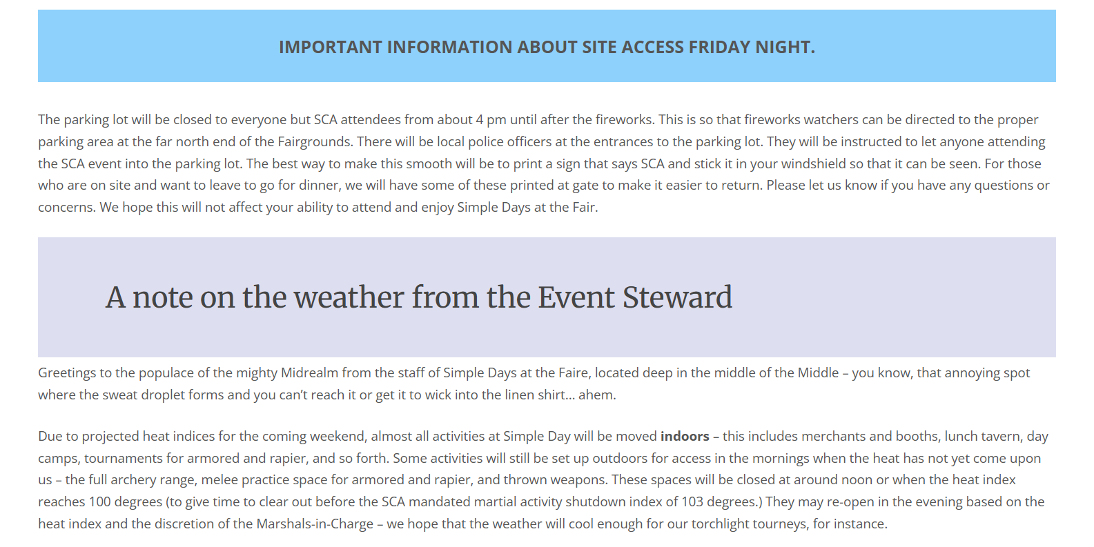 Simple Days is in July, and the Middle Kingdom (the bigger area that includes Indiana, Illinois, Michigan, Ohio, and most of Kentucky) has a rule regarding heat index temperatures and outdoor activities to protect the people attending the event.