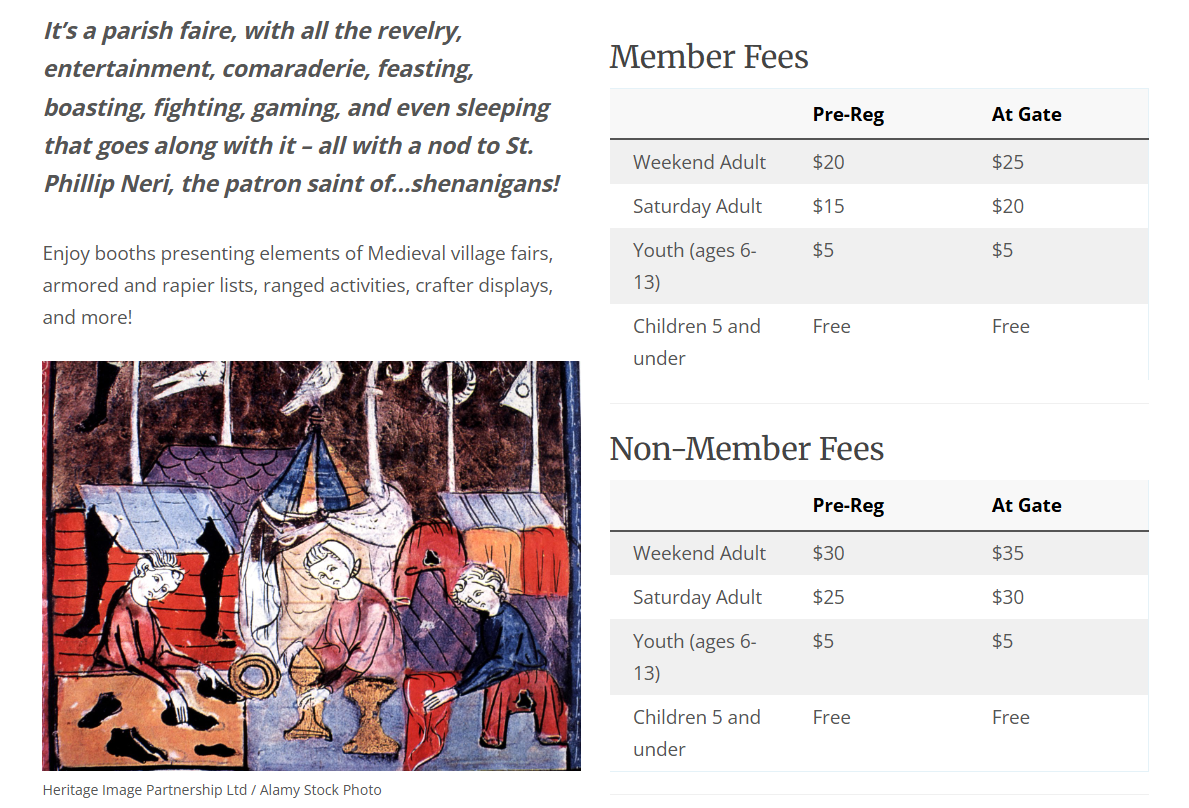 Simple Days theme was a parish faire with “a nod to St. Phillip Neri, the patron saint of…shenanigans.” I included the image provided by the event steward to help provide some imagery to break up the text.
